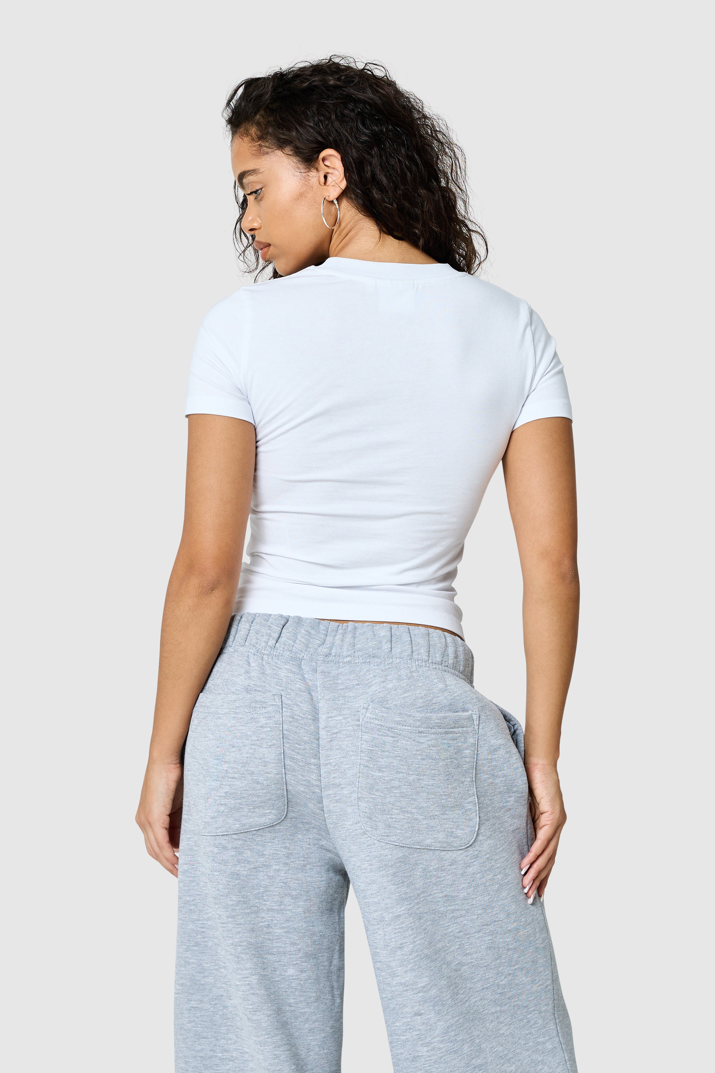 A fitted baby tee designed for everyday wear with a graphic edge. The Nova Tee in White is crafted from a soft cotton-elastane blend for a close, comfortable fit, featuring a front graphic. Clean and versatile, it’s an easy styling essential.
