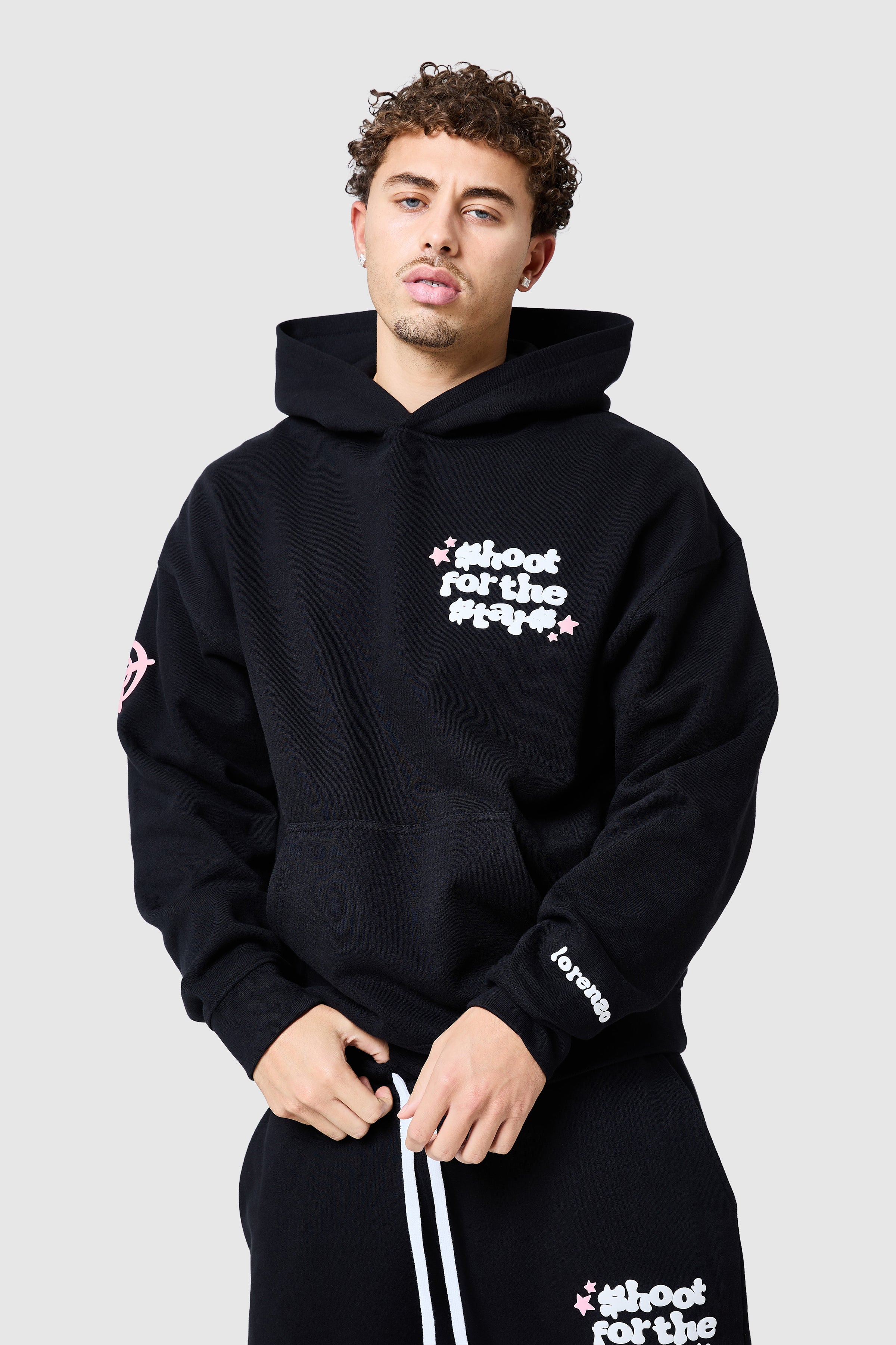 Introducing the Shoot For The Stars Tracksuit. Featuring a bold graphic puff print and ribbed cuffs and hem hood and a wide leg jogger, Shoot for the Stars is a new staple.
