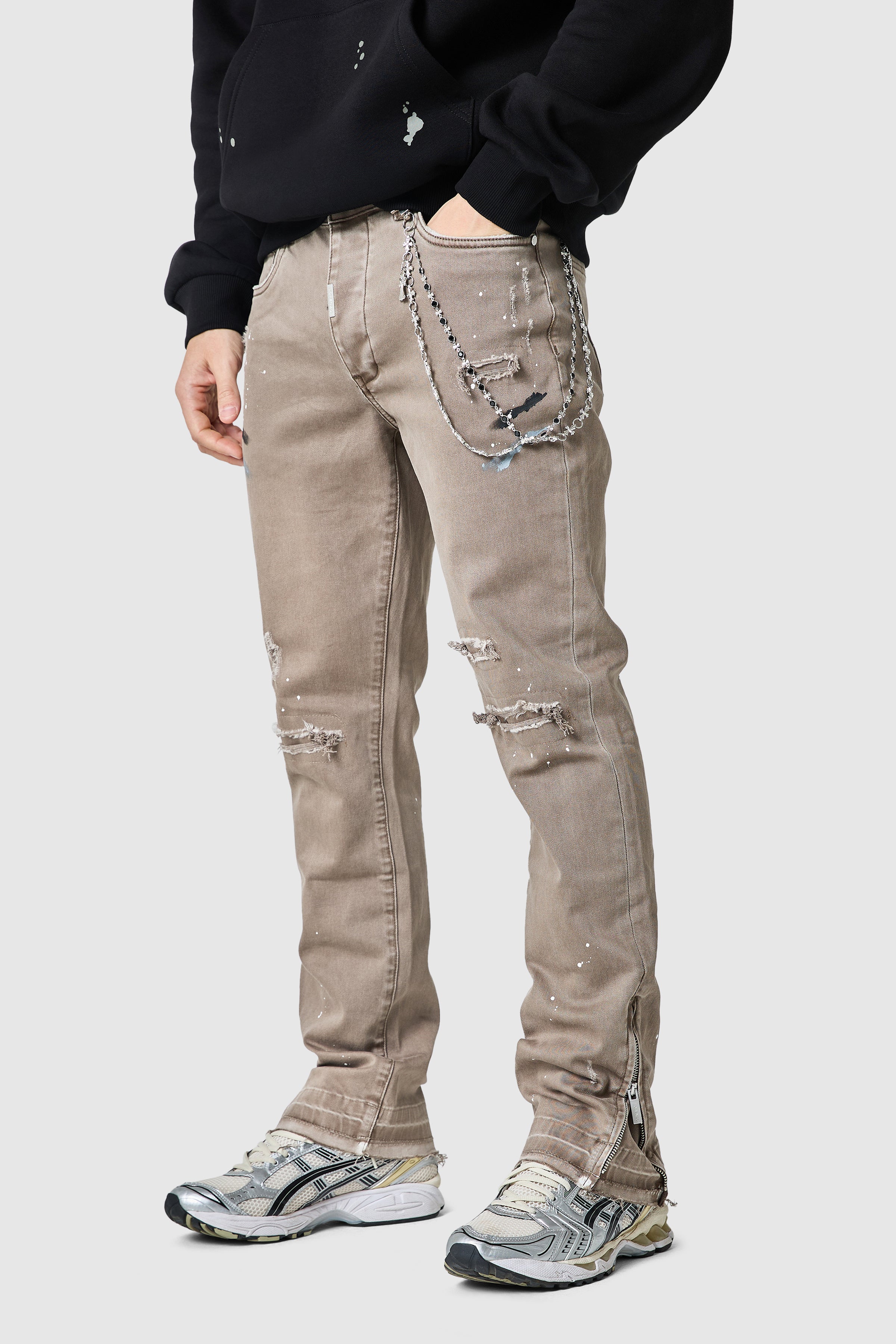 A slim stacked silhouette with elevated edge. Crafted from premium denim in a muted taupe wash, these jeans feature distressed detailing, subtle paint splatter accents and ankle zip finishes for adjustable stacking. Finished with detachable chain detailing for added movement and statement appeal.